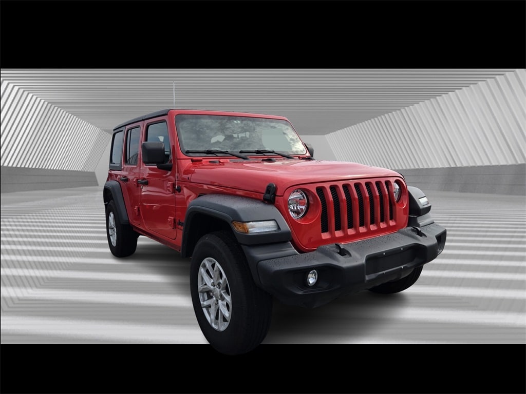 CARFAX One-Owner. low mileage, warranty, rare find, turbo, local trade, 10 year or 100,000 mile Powertrain Warranty, Wrangler Sport S, 2.0L I4 DOHC, 8-Speed Automatic, 4WD, Automatic Headlamps, Deep Tint Sunscreen Windows, Front 1-Touch Down Power Windows, Power Heated Mirrors, Premium Wrapped Steering Wheel, Quick Order Package 22S Sport S, Remote Keyless Entry, Security Alarm, Speed Sensitive Power Locks, Sport S, Sun Visors w/Illuminated Vanity Mirrors, Wheels: 17" x 7.5 Tech Silver Aluminum. Firecracker Red Clearcoat 2023 Jeep Wrangler Sport S 4WD 8-Speed Automatic 2.0L I4 DOHC